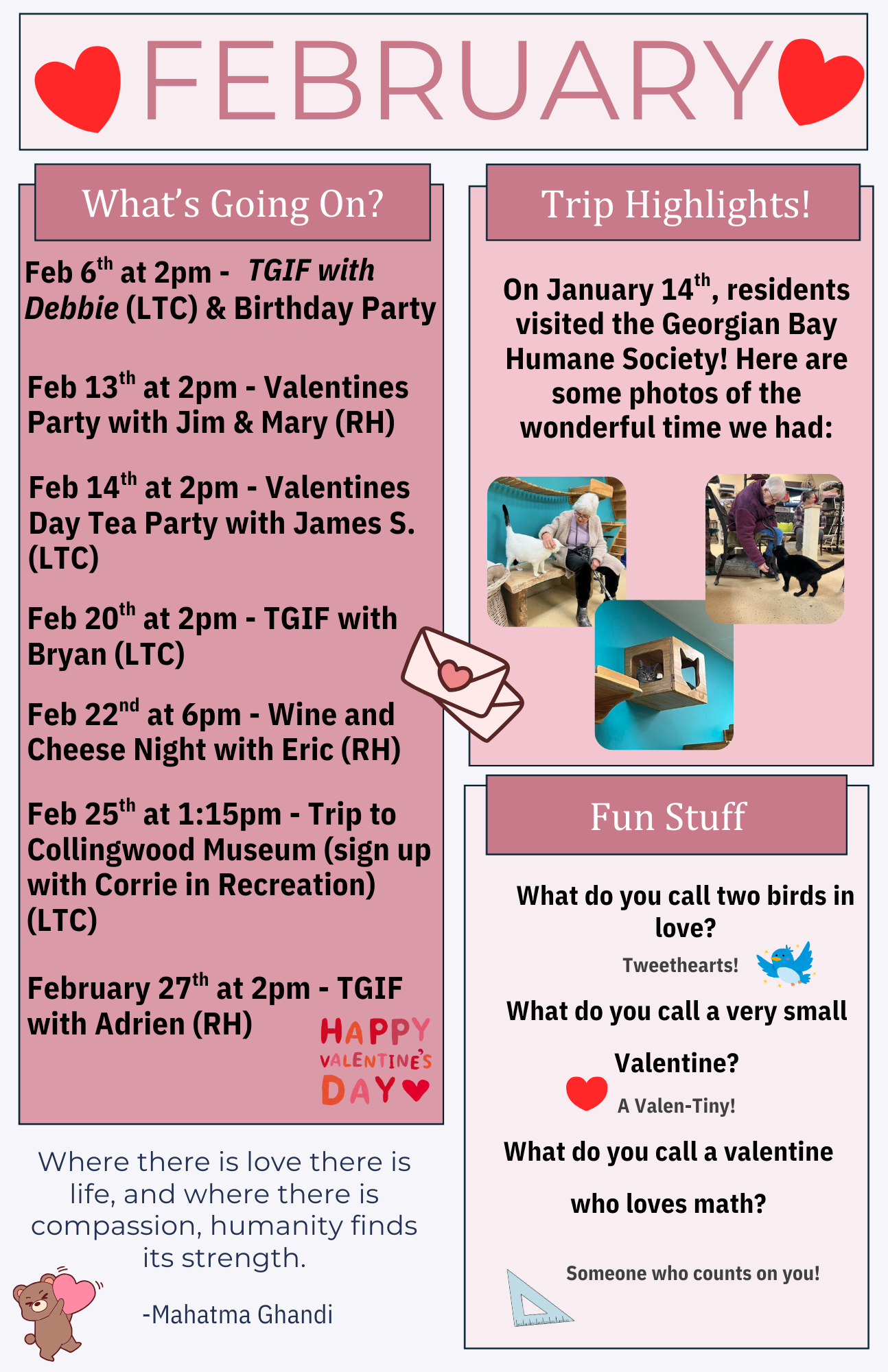 The entire Recreation Department and Marco, the Marketing Specialist, worked hard to create a two-week long Valentine’s Day event for the residents at Bay Haven Care Community. The Recreation Department organized Valentine’s Day themed programs throughout the first and second week of February. Some of the programs included creating a Valentine’s Day posters, arts and crafts, trivia, drama performances, and even making heart-shaped Topper’s pizza with Emaan, a new volunteer who owns all of the Topper’s Pizza in Canada with her family.
